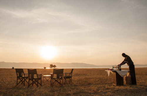 Et elegant dekket bord midt i det endelĂžse landskapet, med en fantastisk utsikt. Dere blir servert som en konge og en dronning. I den magiske timen, nĂ„r den afrikanske solen synker bak horisonten. Bestill gjerne favorittwhiskyen deres. Shaken, not stirred. Lytt til stillheten og nyt Ăžyeblikket. Dette opplever man bare Ă©n gang. SkĂ„l – for dere!